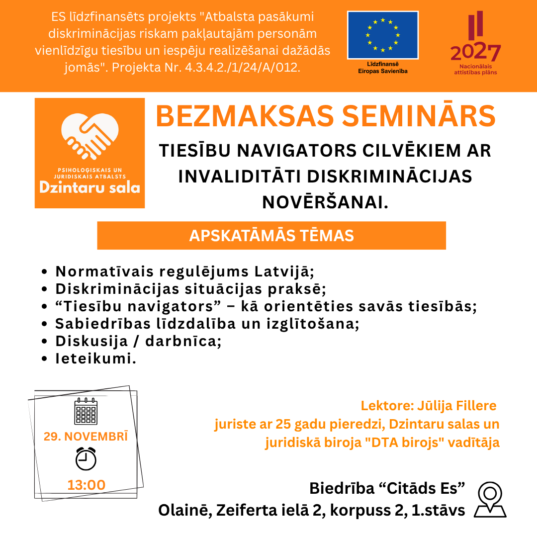 29. novembrī plkst. 13.00 Olainē norisināsies bezmaksas seminārs “Tiesību navigators cilvēkiem ar invaliditāti diskriminācijas novēršanai.”