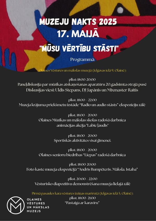 | Olaines Vēstures un mākslas muzejs sestdien, 17. maijā, aicina ikvienu interesentu uz Muzeju nakts pasākumiem. | ![]() |