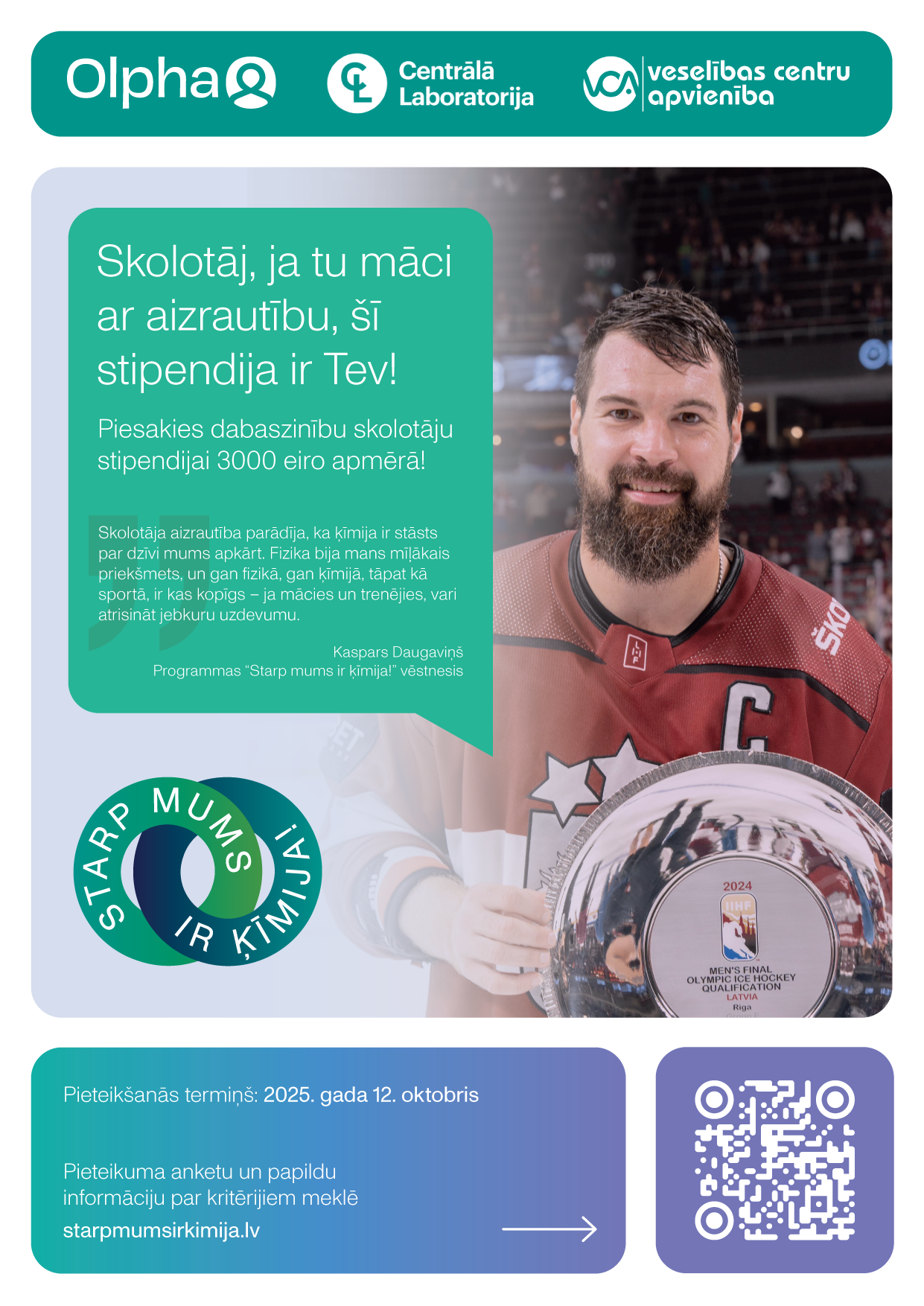 No 22.septembra līdz 12. oktobrim jaunajiem un topošajiem ķīmijas, bioloģijas un matemātikas skolotājiem ir iespēja pieteikties stipendijai programmā “Starp mums ir ķīmija!”. Rudenī 3000 eiro saņems seši topošie skolotāji – divi ķīmijas, divi bioloģijas un divi matemātikas pedagogi.