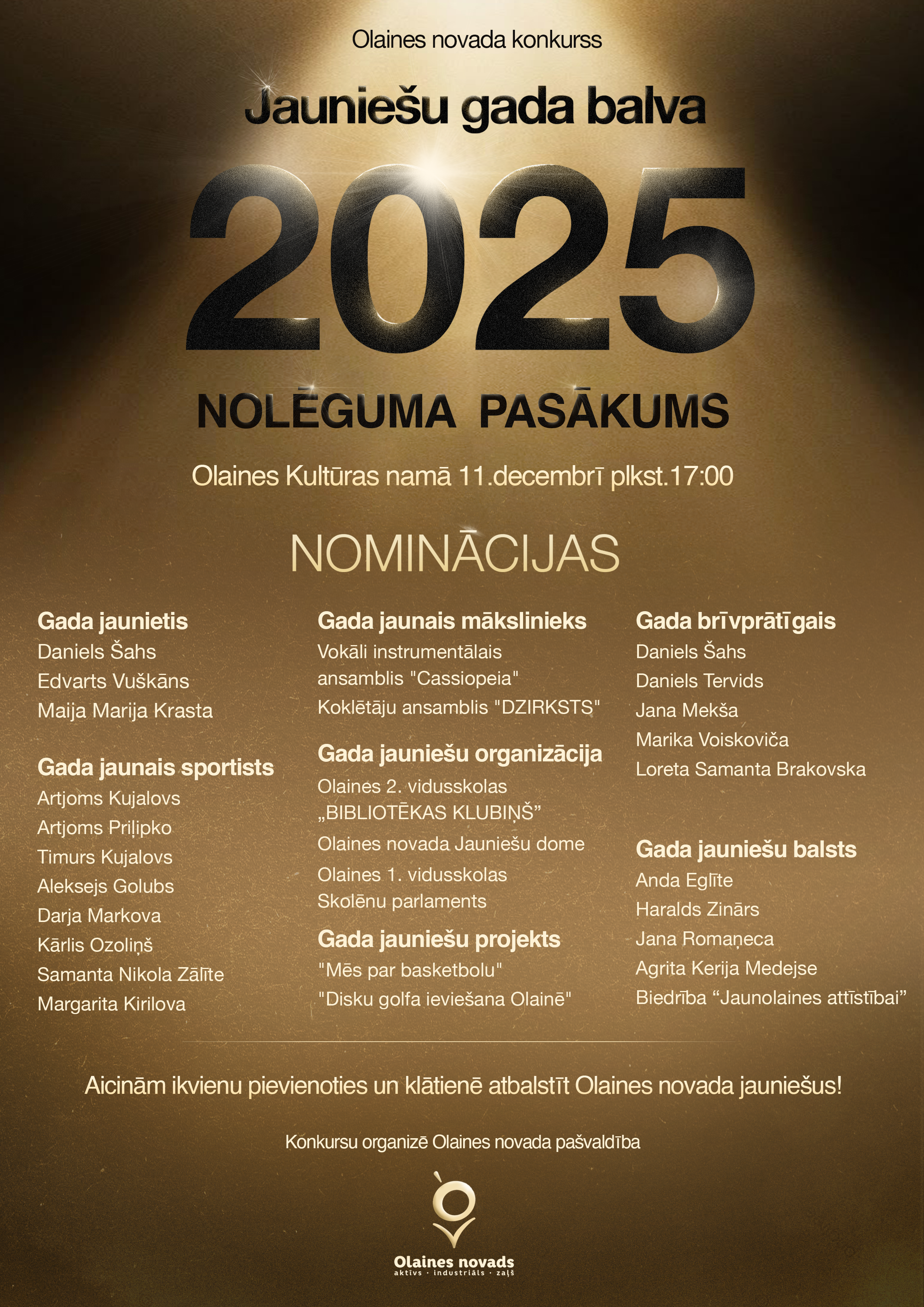 Aicinām ikvienu pievienoties noslēguma pasākumam 11. decembrī plkst. 17.00 Olaines Kultūras namā (Zeiferta ielā 11, Olainē), lai svinētu mūsu jauniešu sasniegumus un kopīgi noskaidrotu šī gada laureātus.