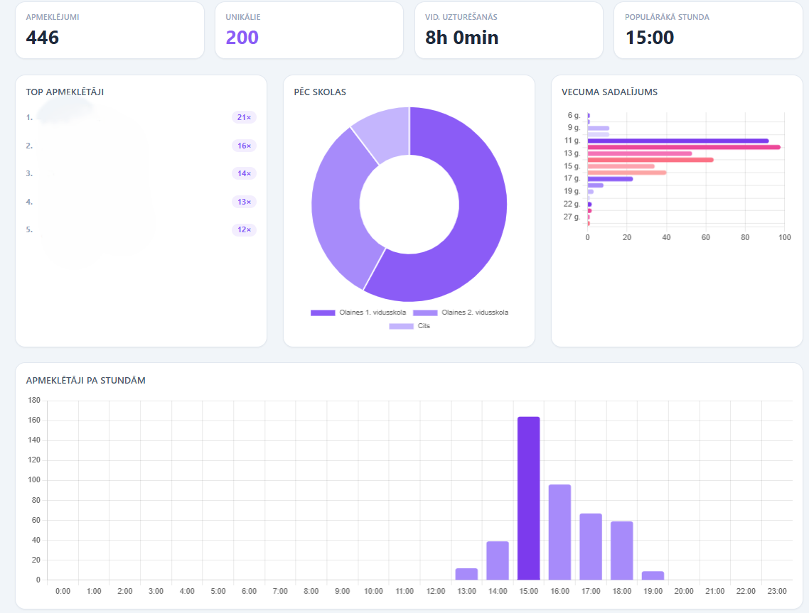 Piemēram, pirmie sistēmas dati jau parāda, ka aktīvākā jauniešu centra apmeklējuma stunda ir plkst. 15.00, kas sakrīt ar laiku pēc mācību stundām, kad jaunieši visbiežāk dodas uz centru. Tāpat redzams, ka lielāko daļu apmeklētāju veido 11–15 gadus veci jaunieši, kas palīdz vēl precīzāk pielāgot aktivitātes šīs vecuma grupas interesēm un vajadzībām.