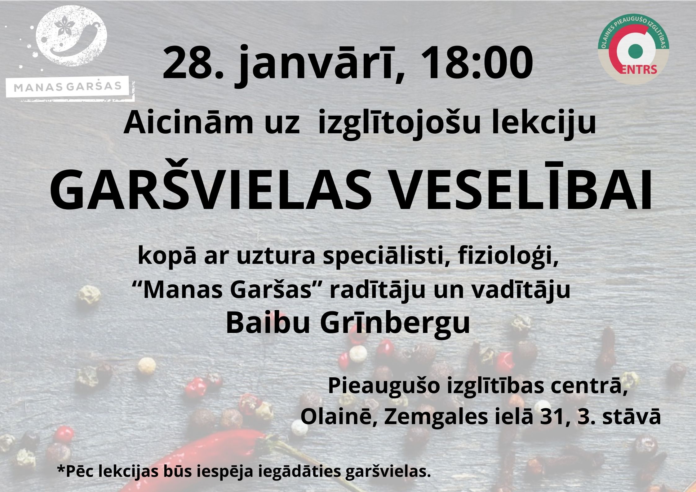 Lekciju vadīs uztura speciāliste un fizioloģe, uzņēmuma „Manas Garšas” radītāja un vadītāja Baiba Grīnberga, kura dalīsies zināšanās par dažādu garšvielu ietekmi uz veselību, to lietošanas principiem un ieguvumiem ikdienā.
