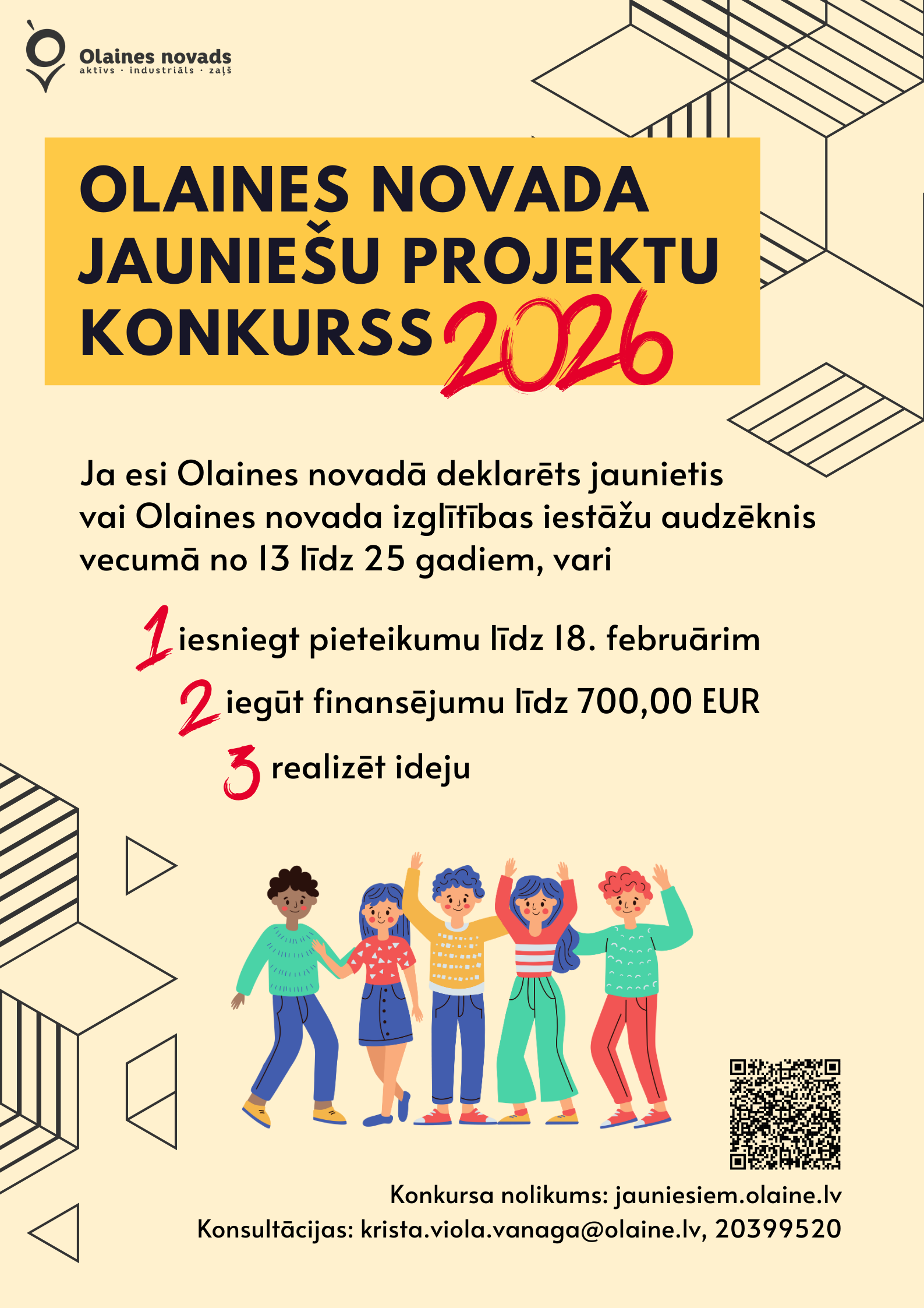 Konkursa ietvaros ikviens Olaines novada jaunietis vecumā no 13 līdz 25 gadiem, kura dzīvesvieta deklarēta Olaines novada administratīvajā teritorijā vai kurš mācās kādā no Olaines novada skolām, var iesniegt savu projektu un pretendēt uz finansējumu idejas realizācijai.