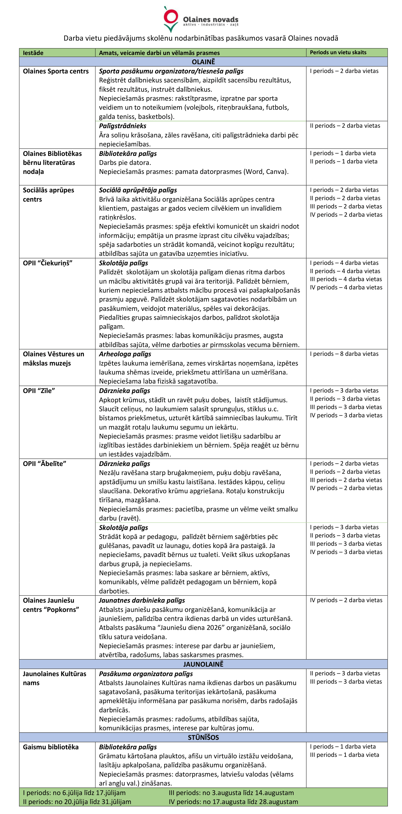 - Skolēni, kas brīvprātīgajā darbā Olaines novadā ir nostrādājuši vismaz 30 stundas nodarbinātības vietas tiks piešķirtas prioritāri.