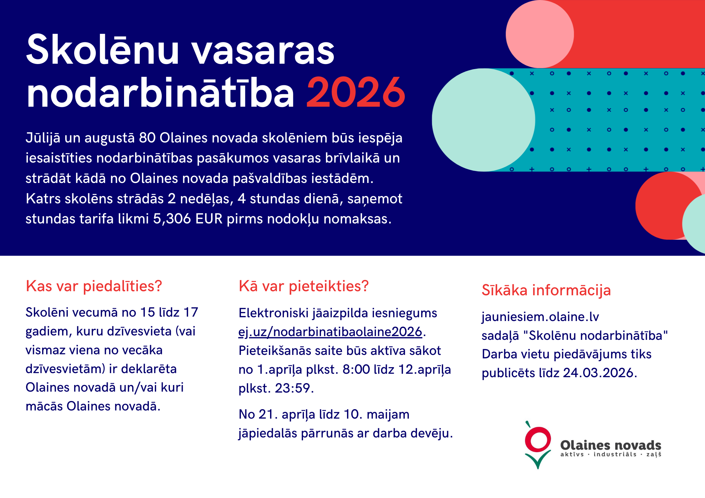 01.04. - 12.04. skolēniem elektroniski jāaizpilda iesniegums saitē - ej.uz/nodarbinatibaolaine2025, kur būs iespēja norādīt vēlamās darba vietas un periodus.