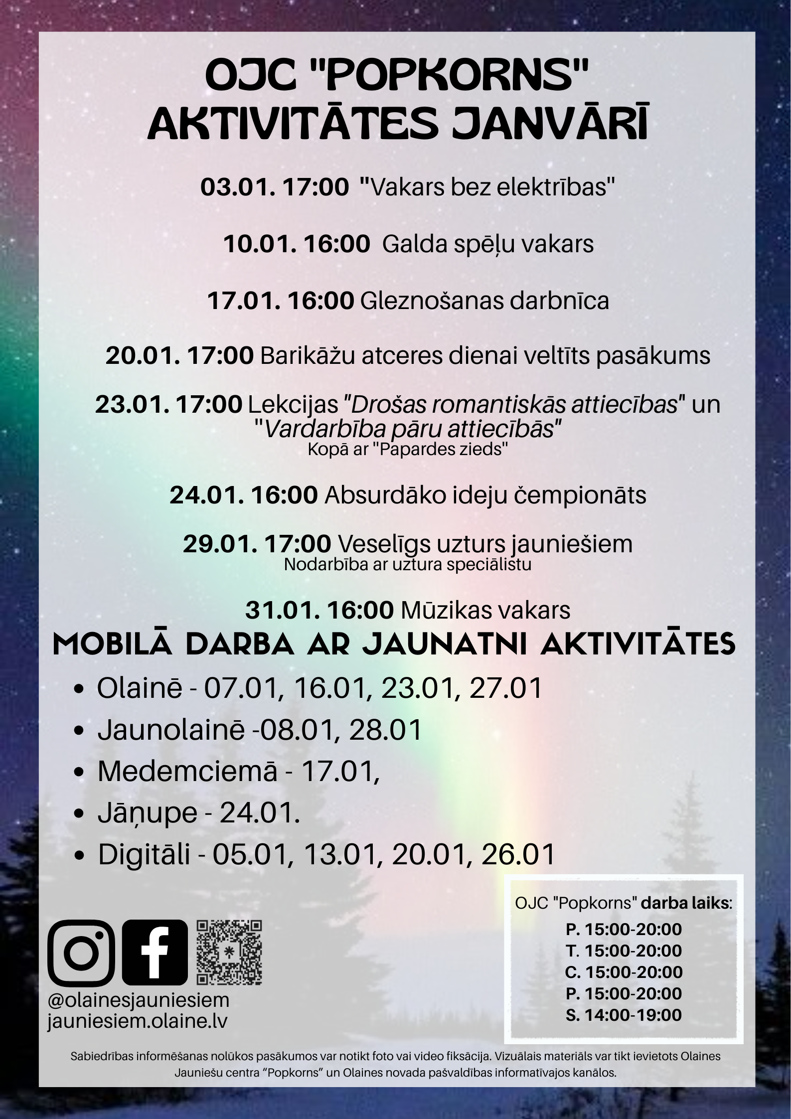 Janvāra aktivitātes Olaines Jauniešu centrā “Popkorns”