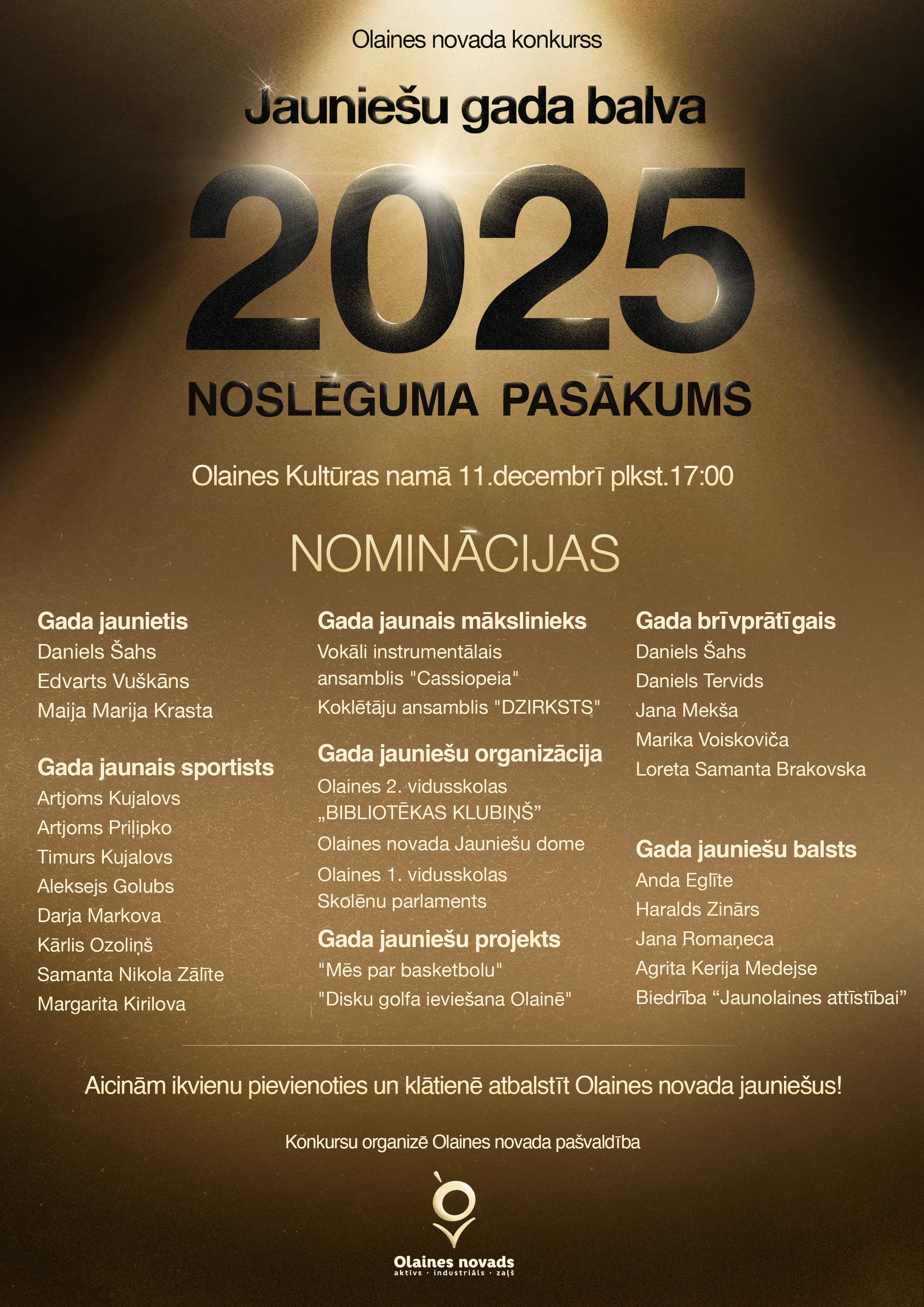 Aicinām ikvienu pievienoties noslēguma pasākumam 11. decembrī plkst. 17.00 Olaines Kultūras namā (Zeiferta ielā 11, Olainē), lai svinētu mūsu jauniešu sasniegumus un kopīgi noskaidrotu šī gada laureātus.