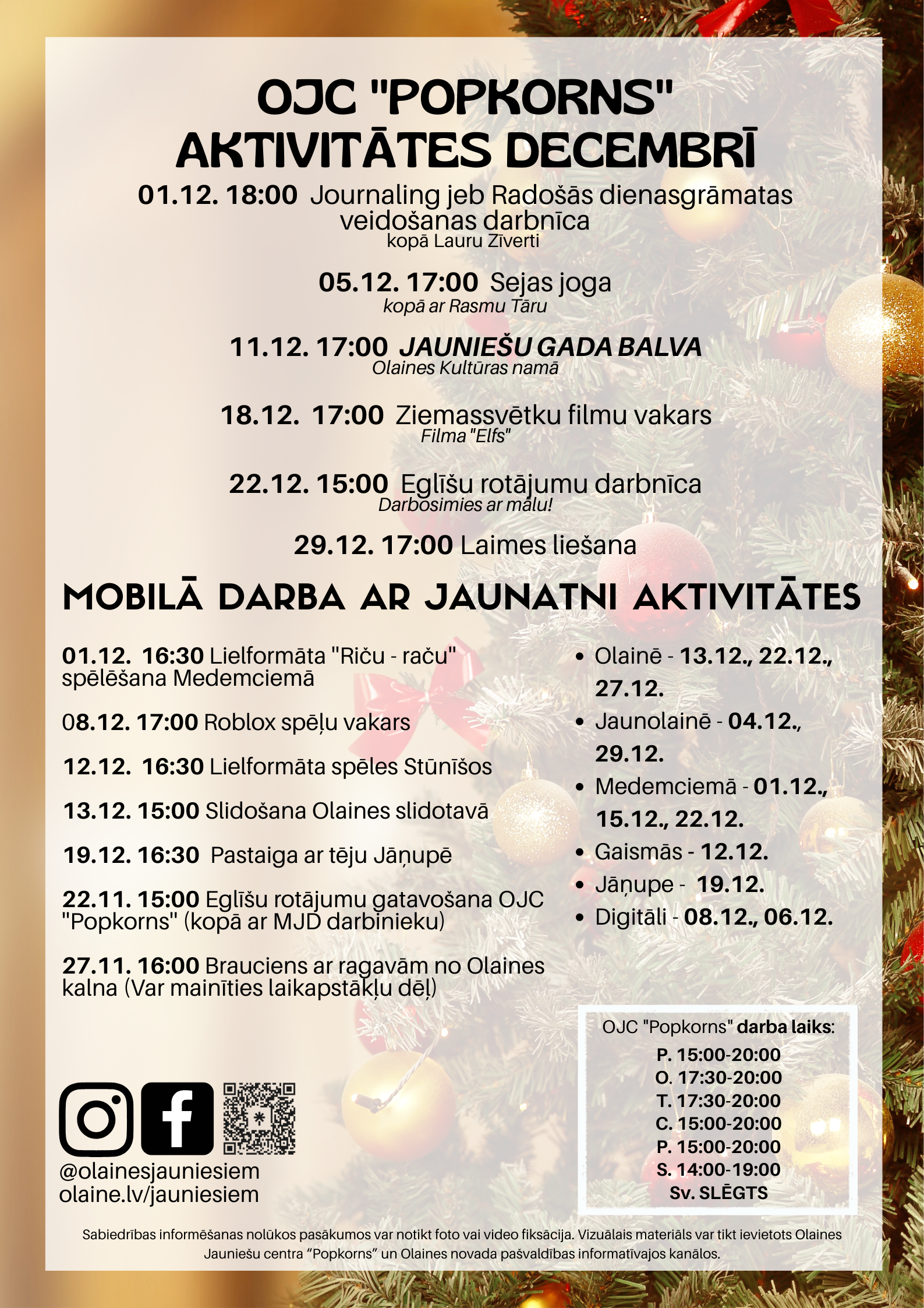Olaines Jauniešu centra "Popkorns" 2025. gada decembra pasākumi