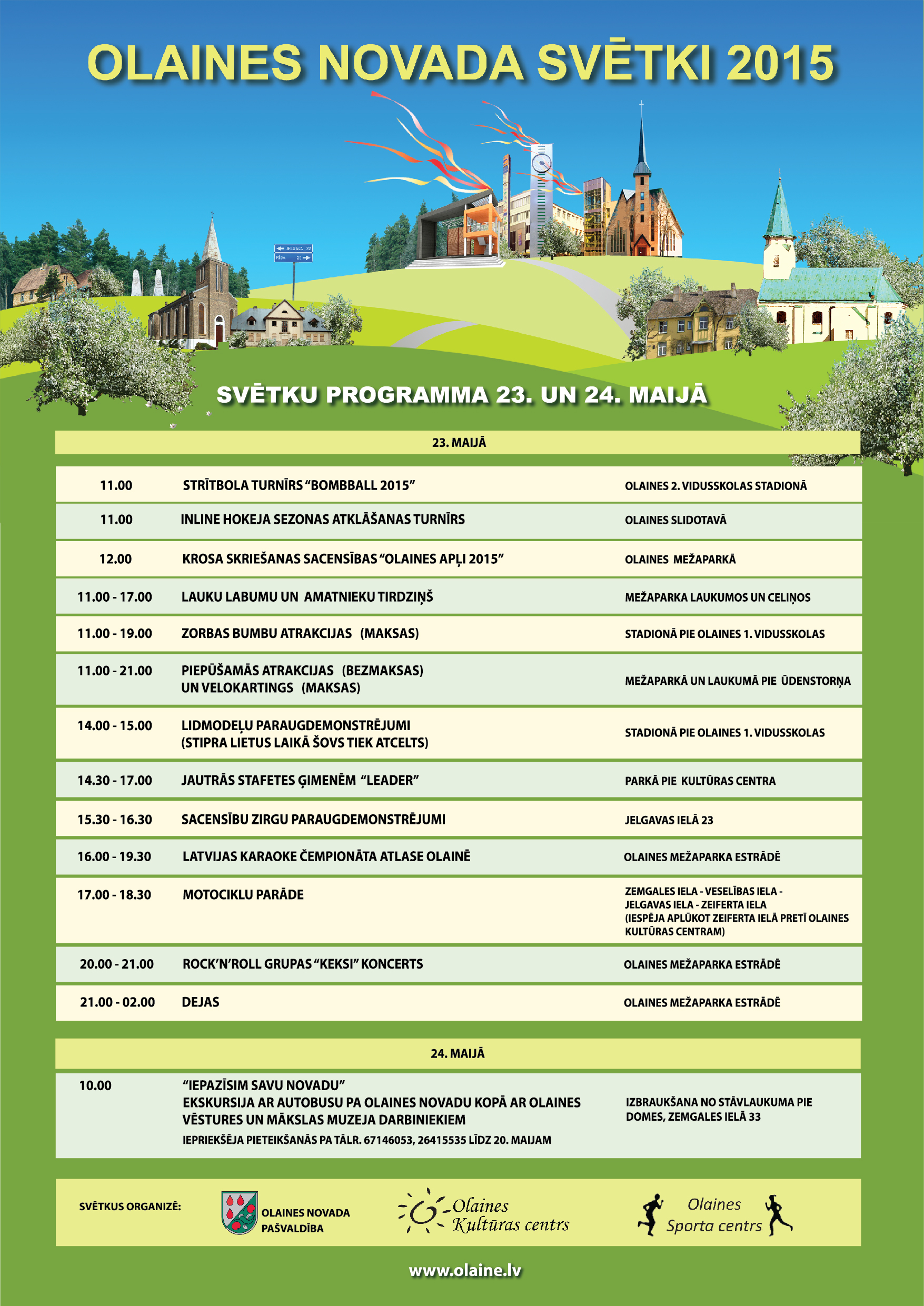 Olaines novada svētki 2015 Pievienots: 12.05.2015 20:39:00 Pasākumu programma lielākā formātā Drukāt rakstu