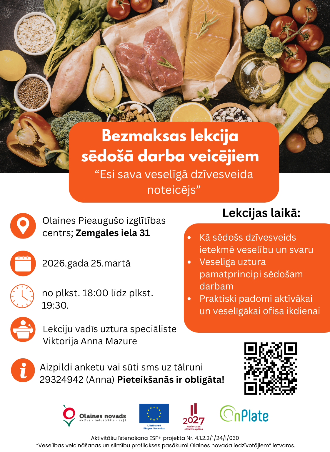 Daudziem no mums ikdiena paiet sēdošā darbā, un tas bieži ierobežo veselīgu paradumu ievērošanu. Lai veicinātu izpratni par veselīgu uzturu un tā nozīmi labsajūtas un veselības saglabāšanā, 2026. gada 25. martā no plkst. 18.00 līdz 19.30 Olaines Pieaugušo izglītības centrā, Zemgales ielā 31, notiks bezmaksas lekcija sēdoša darba veicējiem “Esi sava veselīgā dzīvesveida noteicējs”.
