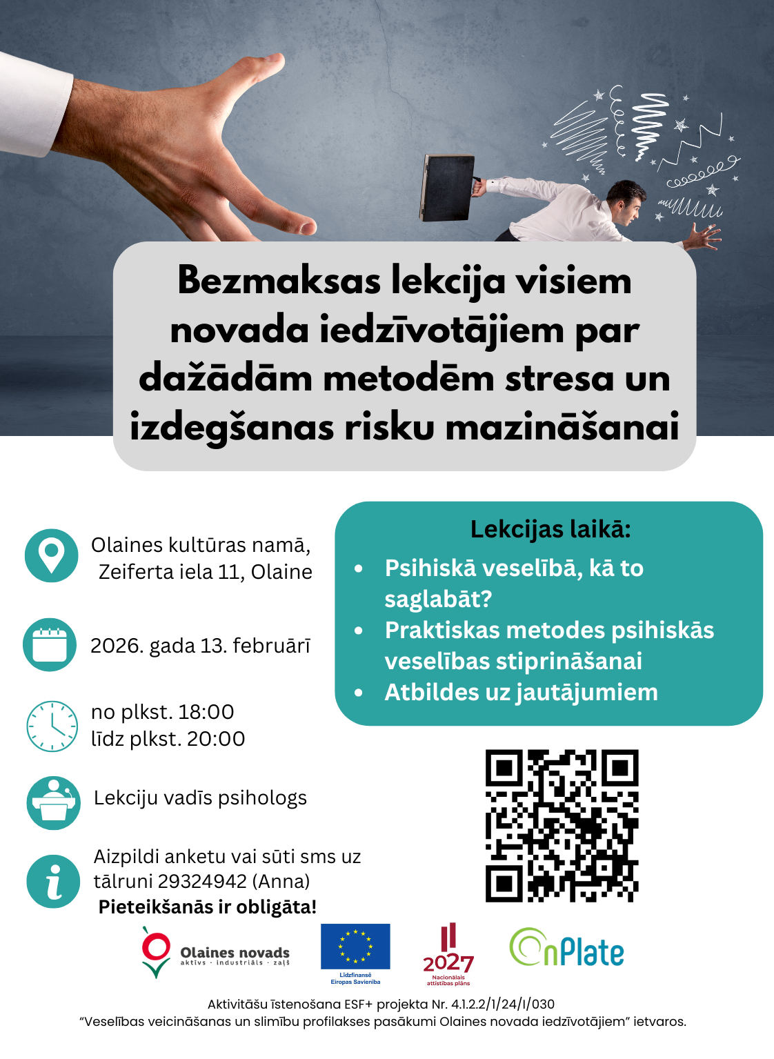 Aicinām Olaines novada iedzīvotājus piedalīties bezmaksas lekcijā par dažādām metodēm stresa un izdegšanas riska mazināšanai. Lekciju vadīs psihologs, sniedzot ieskatu psihiskās veselības saglabāšanā un praktiskos paņēmienos tās stiprināšanai ikdienā.