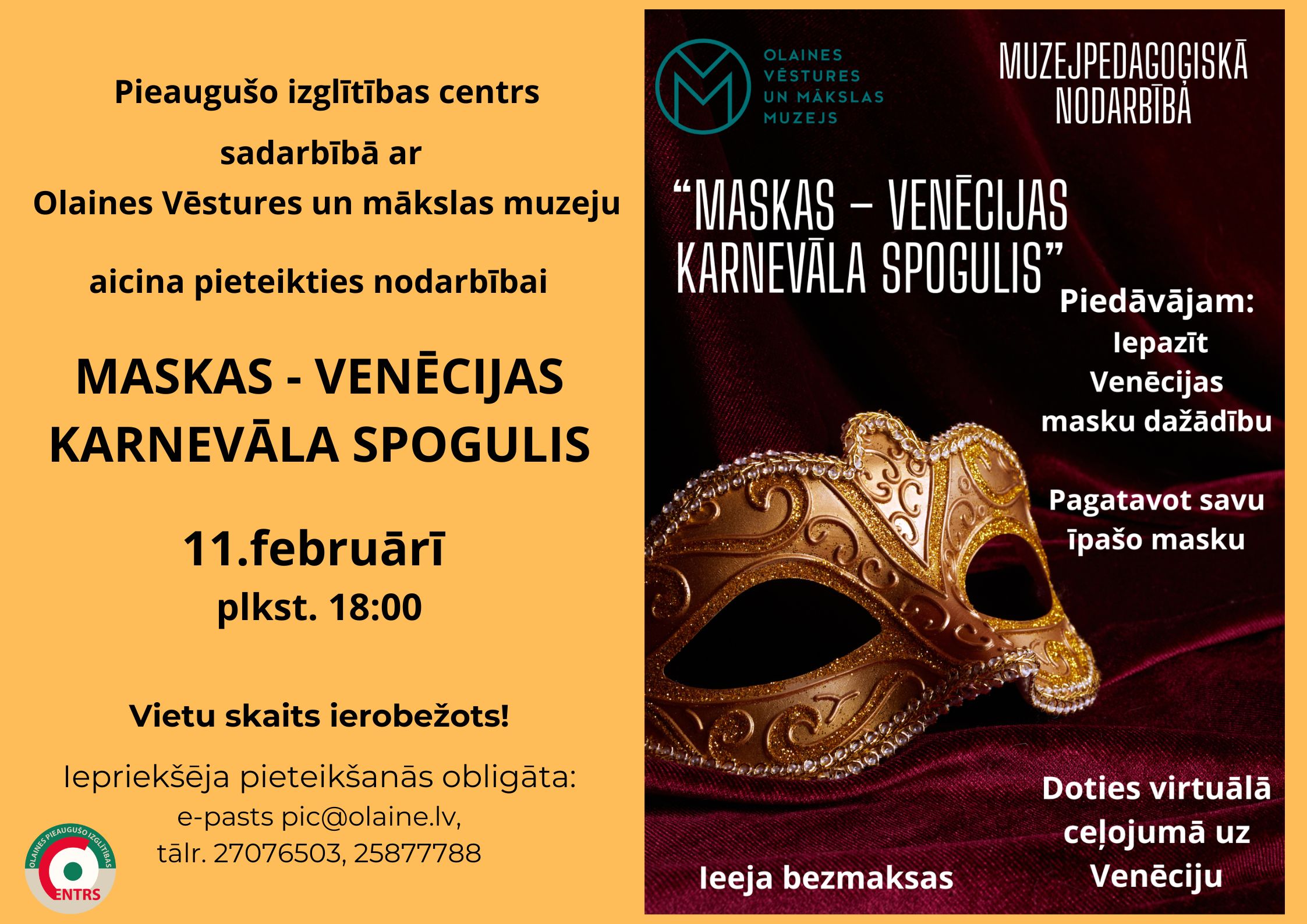 Pieaugušo izglītības centrs sadarbībā ar Olaines Vēstures un mākslas muzejs aicina uz aizraujošu muzejpedagoģisko nodarbību, kas veltīta Venēcijas karnevāla noslēpumainajai un krāšņajai pasaulei.