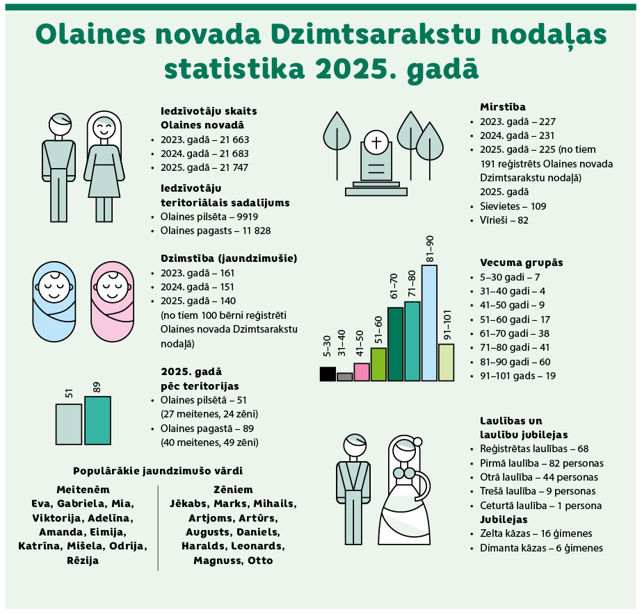 2025. gadā Olaines novadā reģistrēti 140 jaundzimušie, no tiem 100 bērni reģistrēti tieši Olaines novada Dzimtsarakstu nodaļā.