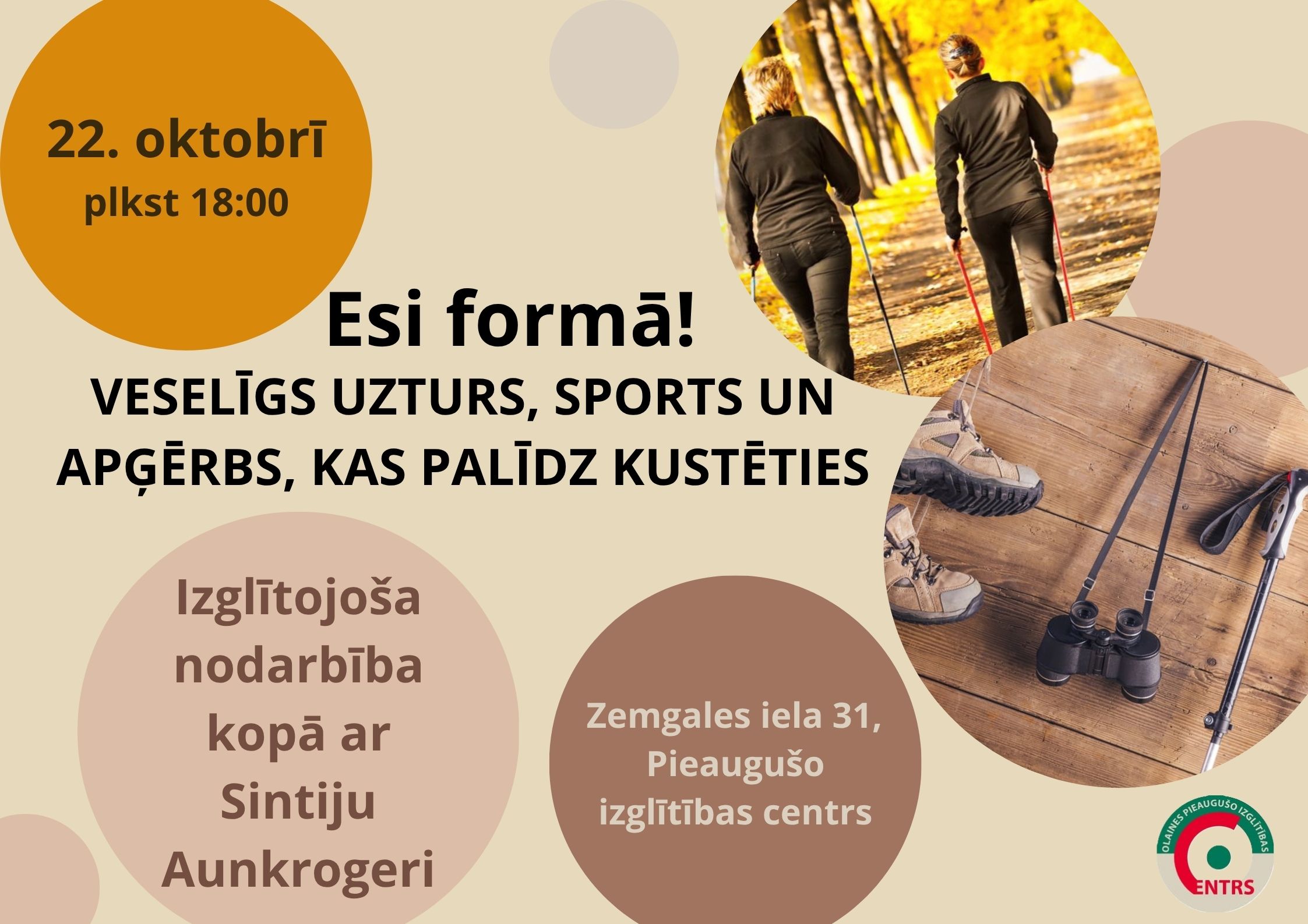 Pieaugušo izglītības centrs 22. oktobrī aicina interesentus apmeklēt izglītojošu nodarbību kopā ar sporta speciālisti Sintiju Aunkrogeri. Būs iespēja uzzināt vērtīgu un noderīgu informāciju, iepazīties ar prezentāciju, iepazīt savas zināšanas ar testa palīdzību, aktīvi darboties un piedalīties spēlē ar iespēju iegūt dāvanu.