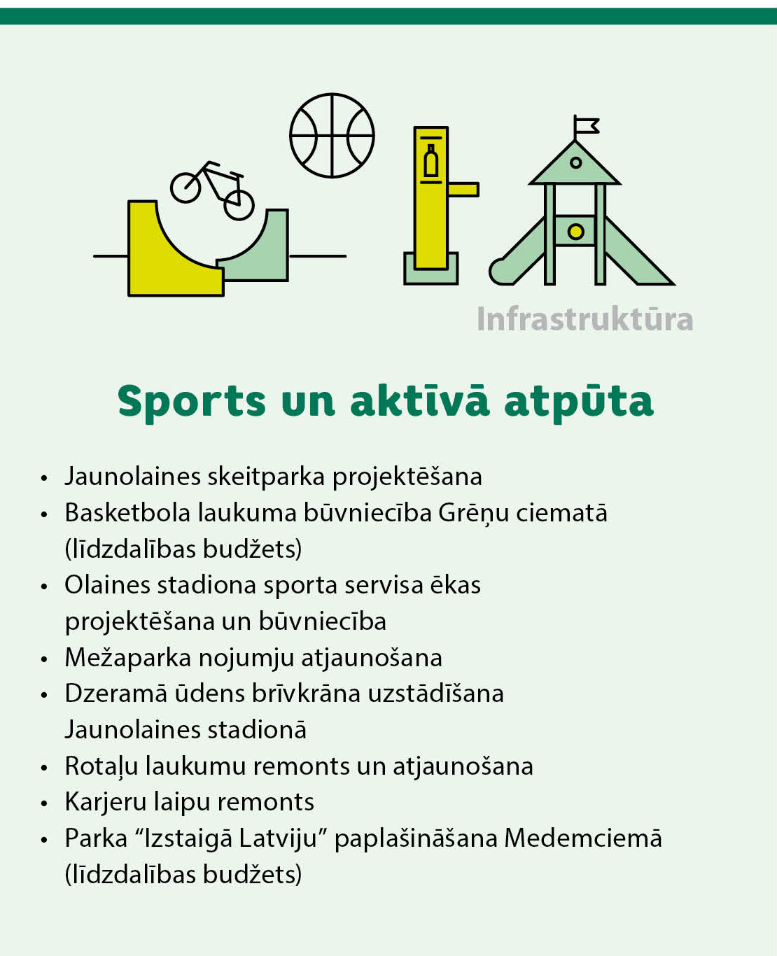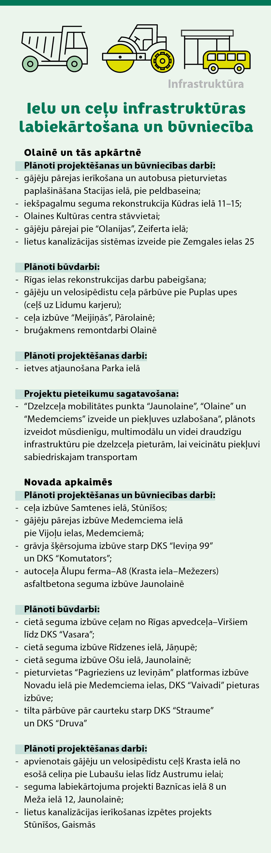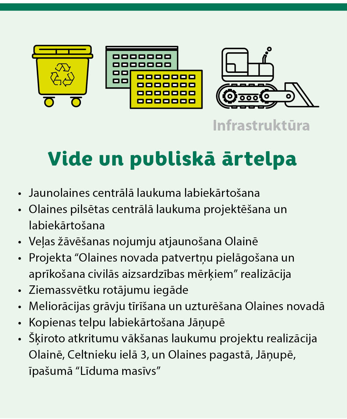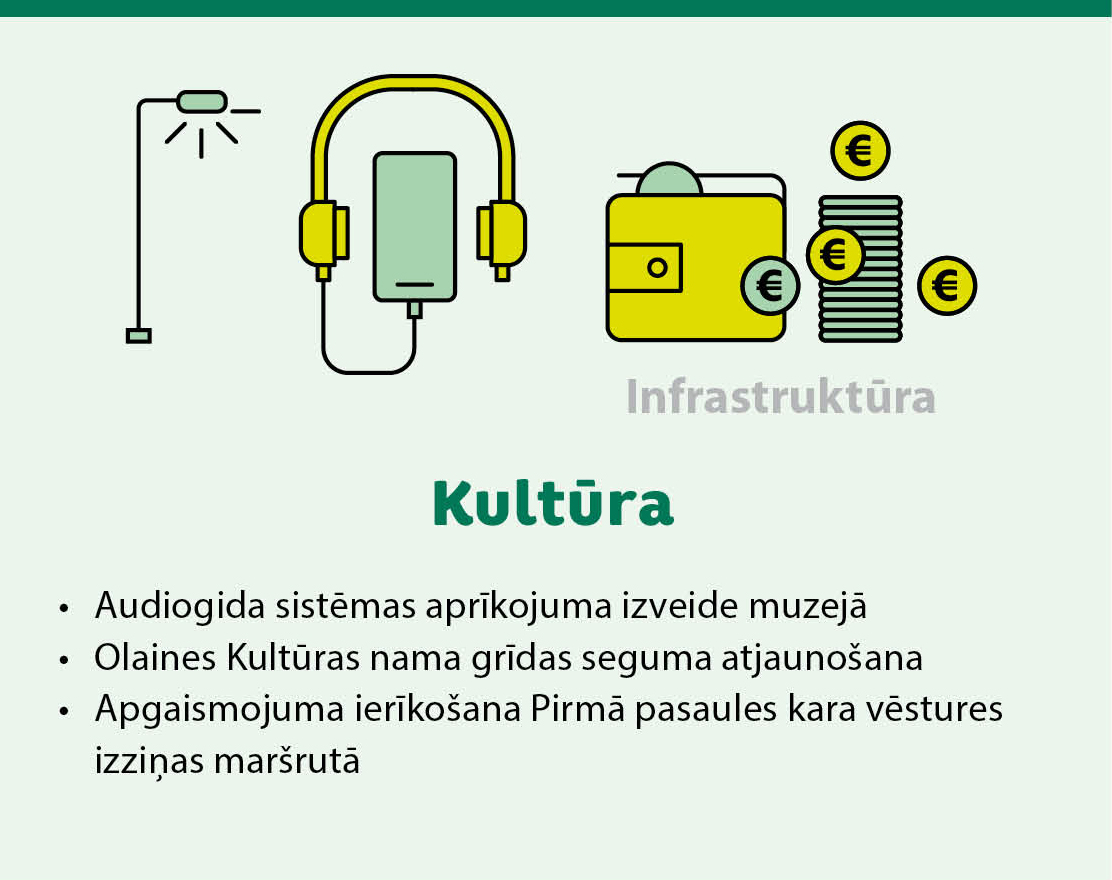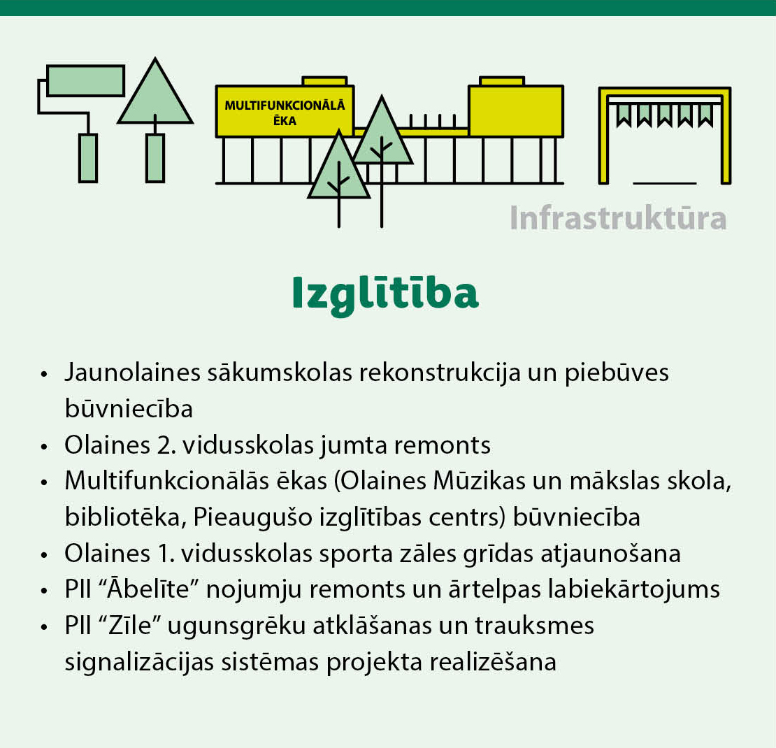 Pašvaldība turpinās daudzdzīvokļu māju energoefektivitātes uzlabošanas (renovācijas) atbalsta programmu, paredzot 1 132 501 eiro energoauditiem, būvprojektu izstrādei un banku procentu segšanai. Vienlaikus budžetā paredzēti līdzekļi izglītības, sporta un kultūras infrastruktūras attīstībai, tostarp Olaines sākumskolas ēkas būvniecībai Jaunolainē, Olaines 2. vidusskolas jumta remontam, Olaines stadiona sporta servisa ēkas un multifunkcionālās ēkas (Olaines Mūzikas un mākslas skola, Olaines bibliotēka un Olaines Pieaugušo izglītības centrs) būvniecībai.