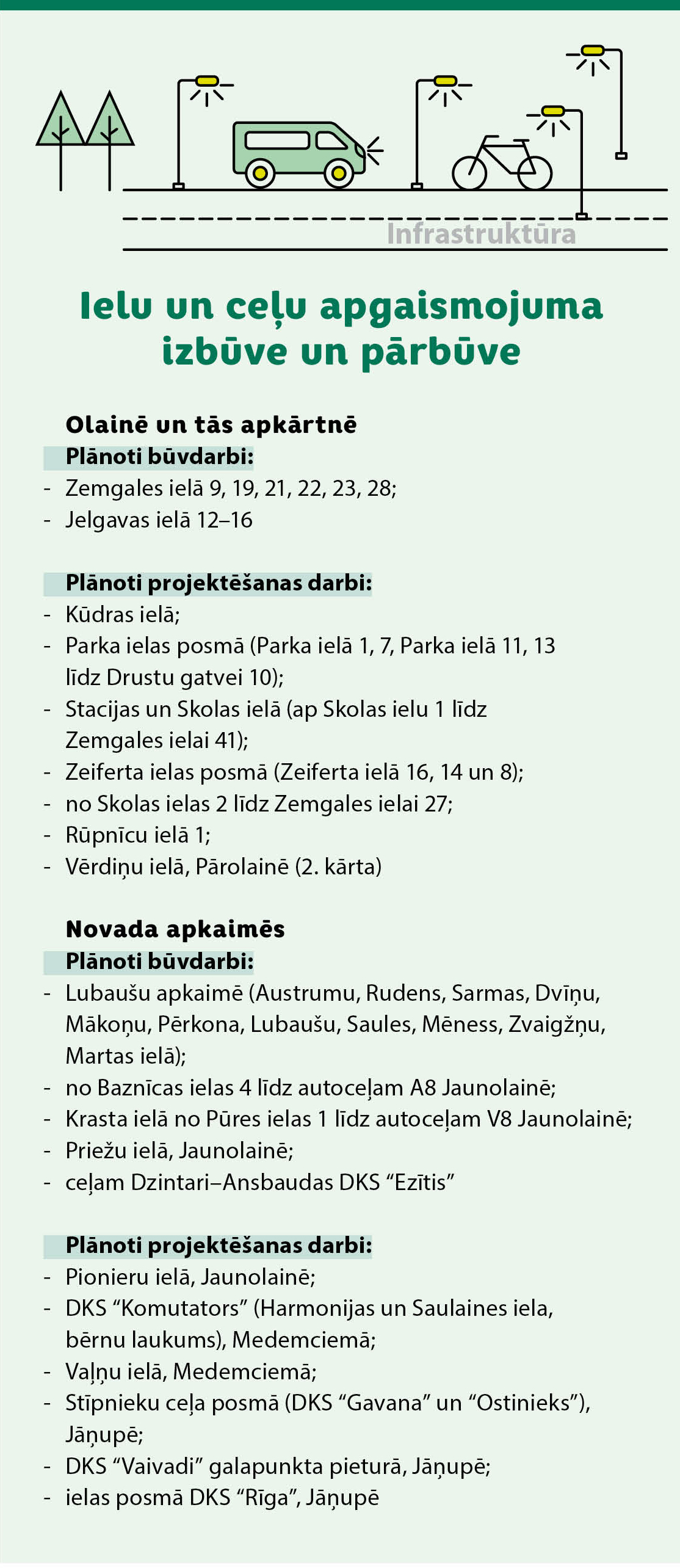 Apgaismojuma uzturēšanai un rekonstrukcijai 2026. gadā paredzēti 1 096 717 eiro, nodrošinot gan esošo apgaismojuma sistēmu uzturēšanu, gan jaunu apgaismojuma risinājumu projektēšanu, rekonstrukciju un izbūvi Olainē, Jaunolainē un citās novada apkaimēs, uzlabojot satiksmes drošību un iedzīvotāju ikdienas komfortu.