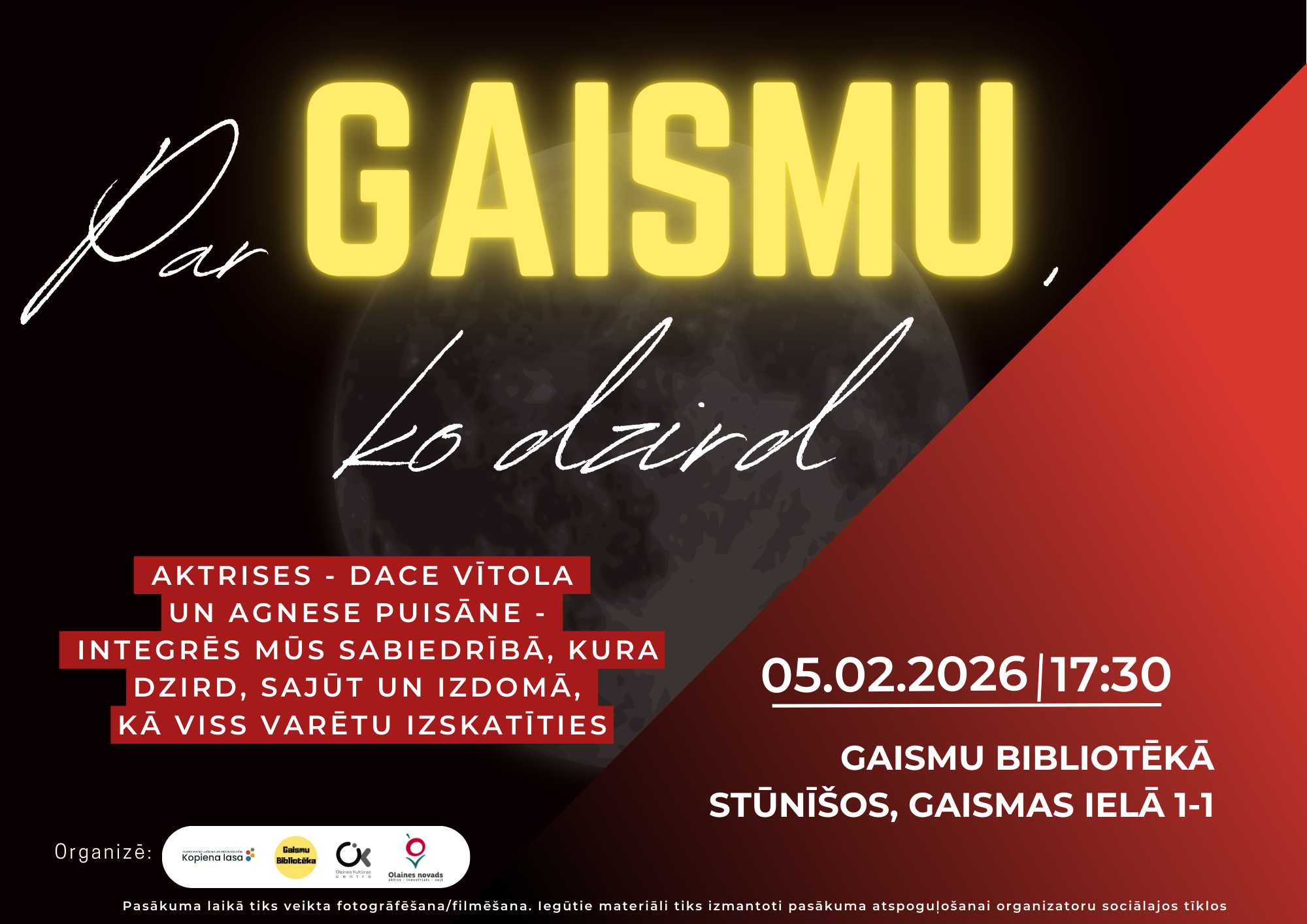 05. februārī Gaismu bibliotēkā plkst. 17.30 Tikšanās ar aktrisēm Daci Vītolu un Agnesi Puisāni.