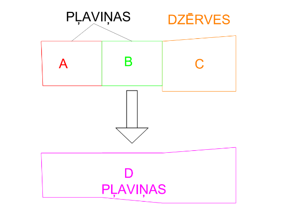 Kas jādara īpašniekam? Īpašnieks brīvā formā raksta iesniegumu Olaines novada pašvaldībai, ka vēlas apvienot nekustamo īpašumu zemes vienības A, B, C nekustamā īpašuma Pļaviņas sastāvā, kura rezultātā izveidosies zemes vienība D (skatīt attēlā).
