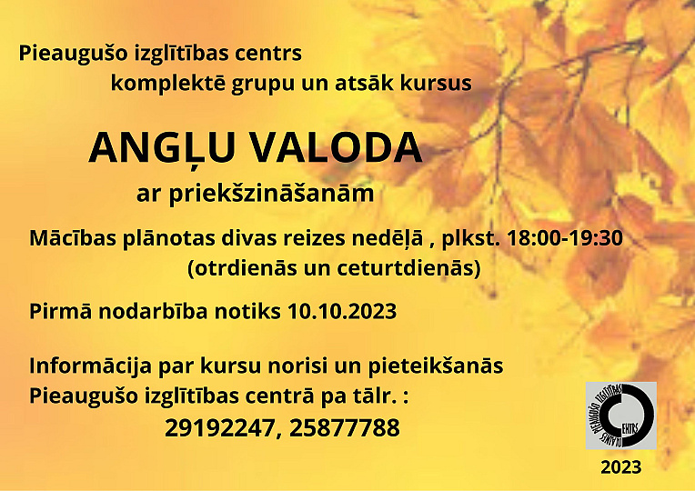 Informācija par kursu norisi un pieteikšanās Pieaugušo izglītības centrā pa tālr.: 25877788, 29192247.