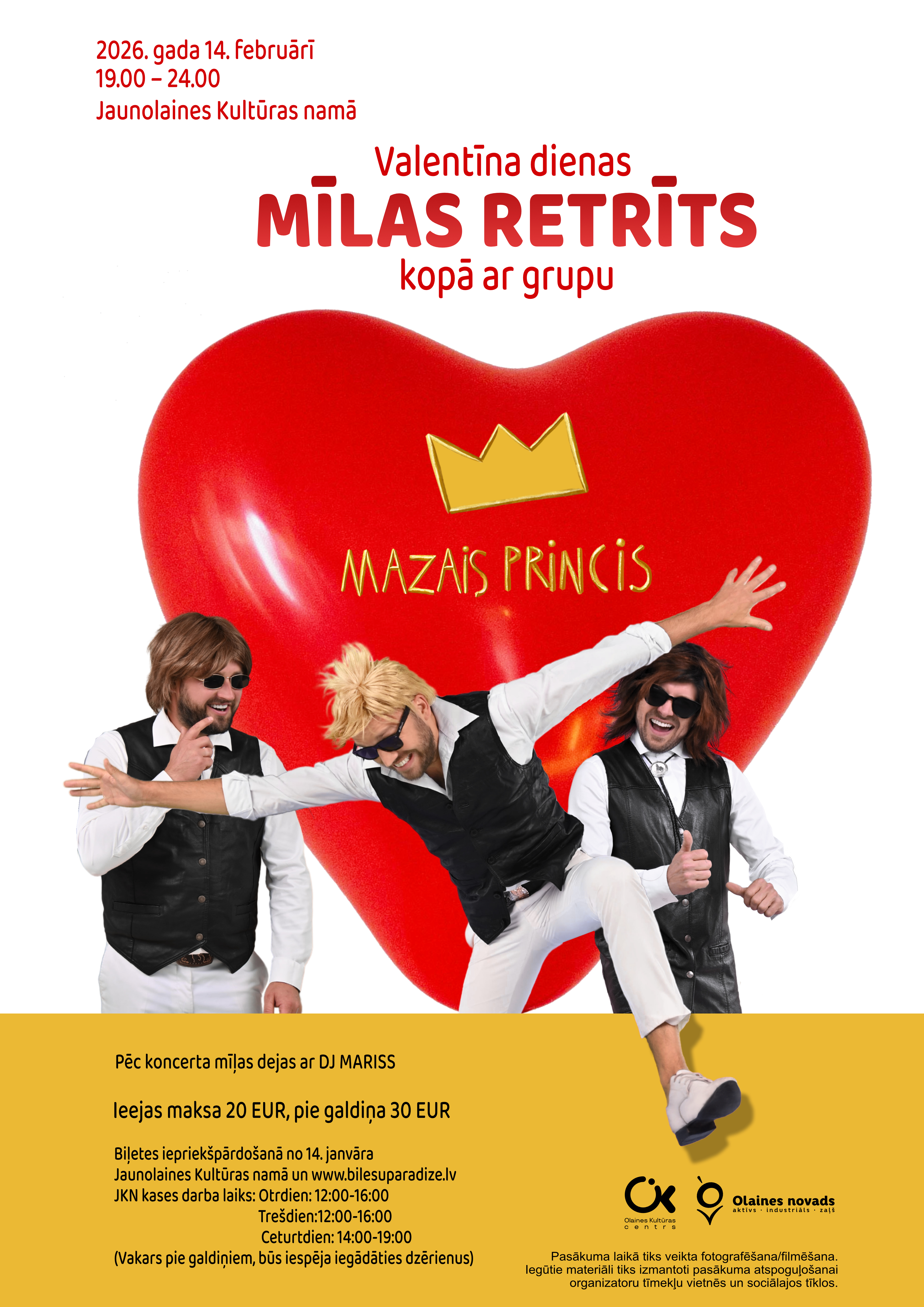 14. februārī Jaunolaines Kultūras namā no plkst. 19.00 līdz 24.00 Valentīna dienas MĪLAS RETRĪTS kopā ar grupu MAZAIS PRINCIS!