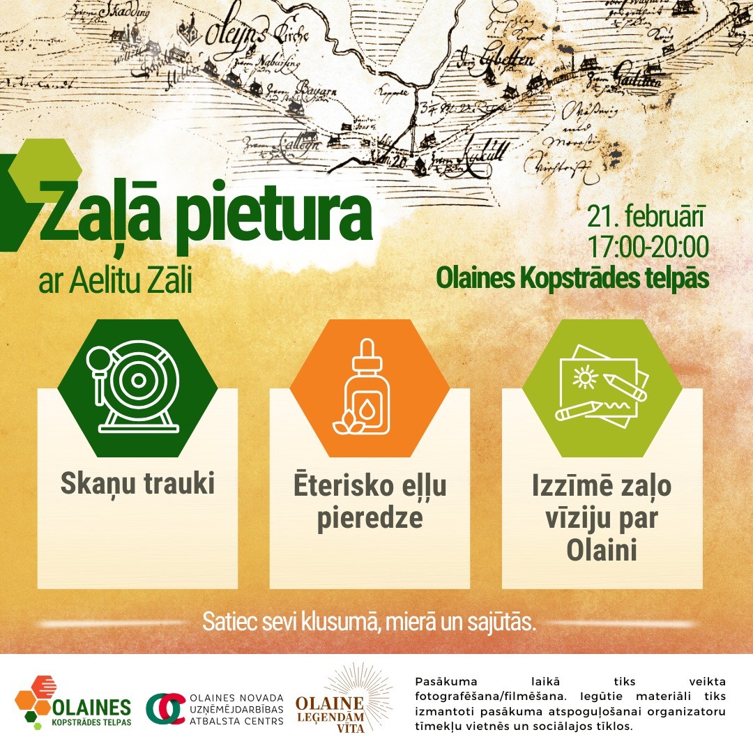 21. februārī no plkst. 17.00 līdz 20.00 Olaines Kopstrādes telpās, dzenoties Olaines Jumpravai pa pēdām, aicinām uz mierpilnu un sajūtās balstītu pieredzi